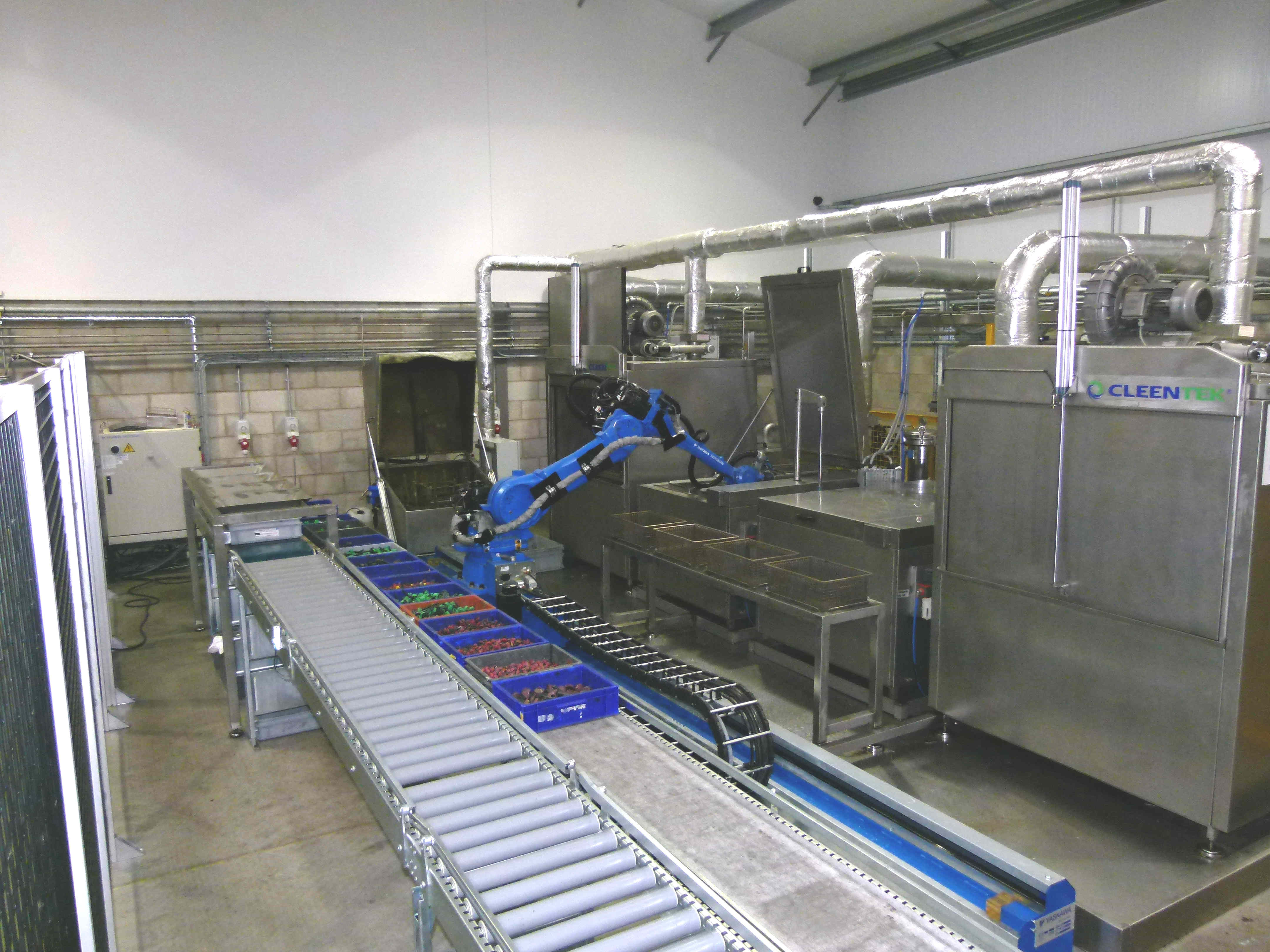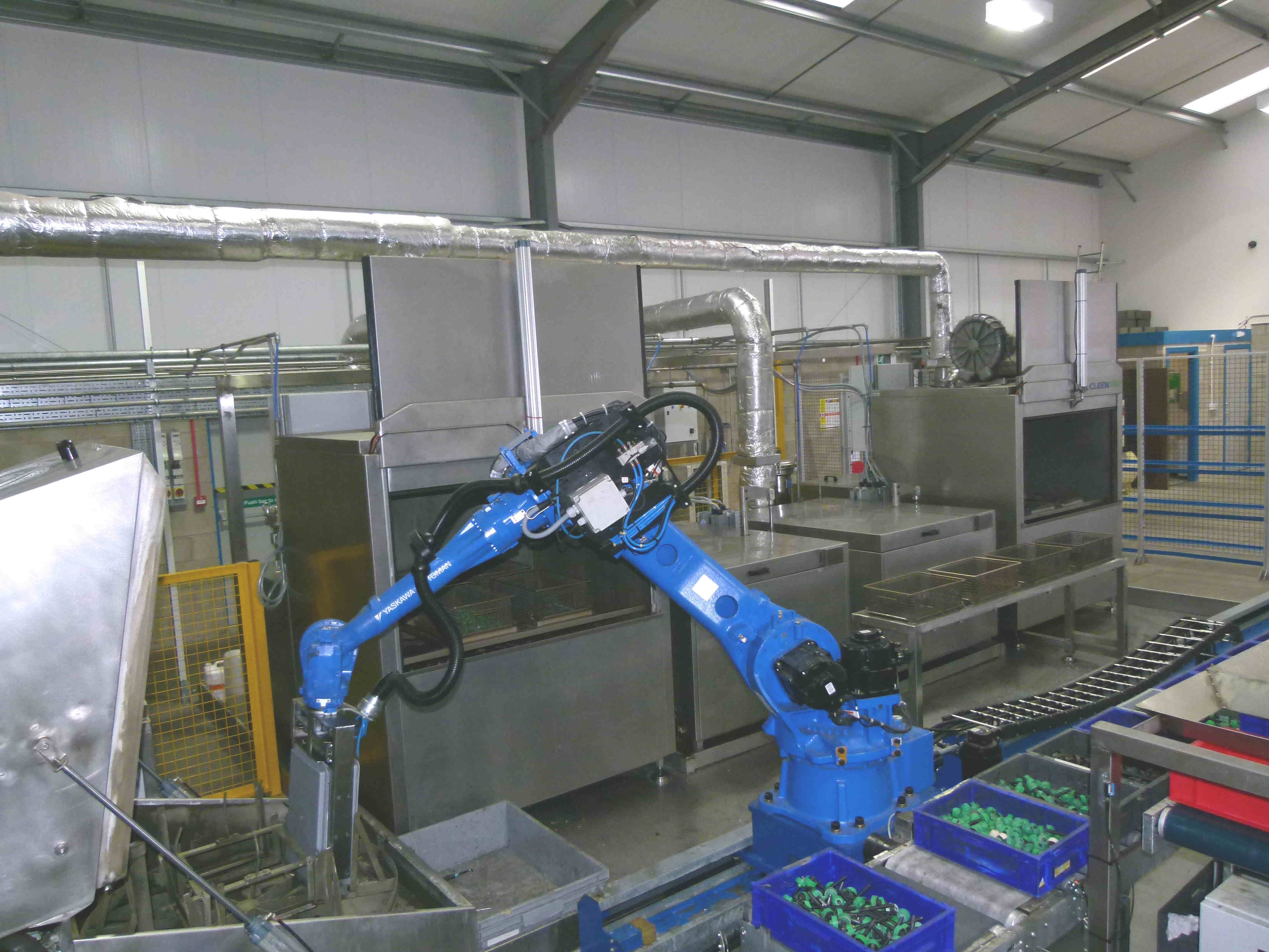 Contaminated fasteners arrive at the line in plastic boxes which are then emptied by the robot into cleaning baskets, also placing the dirty boxes into a box cleaning machine. Working four baskets per batch, the fasteners then undergo a six-stage cleaning process: pre-wash, dry, ultrasonic cleaning, post-wash, rinsing with corrosion inhibitor, and dry.